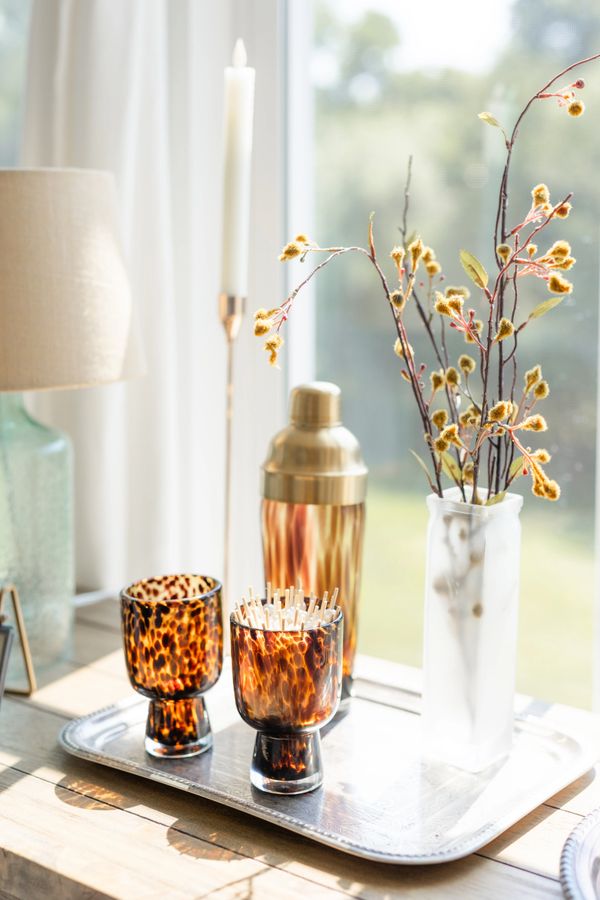This home features beautiful vintage tile, vaulted wood ceilings, and styled warmth throughout to create the perfect space for gatherings. The kitchen design includes olive green painted cabinets, beveled marble tile walls, honed marble countertops, a custom stone hood over the chef's cooking area, and a special breakfast nook featuring Serena & Lily wallpaper + Schumacher fabric.